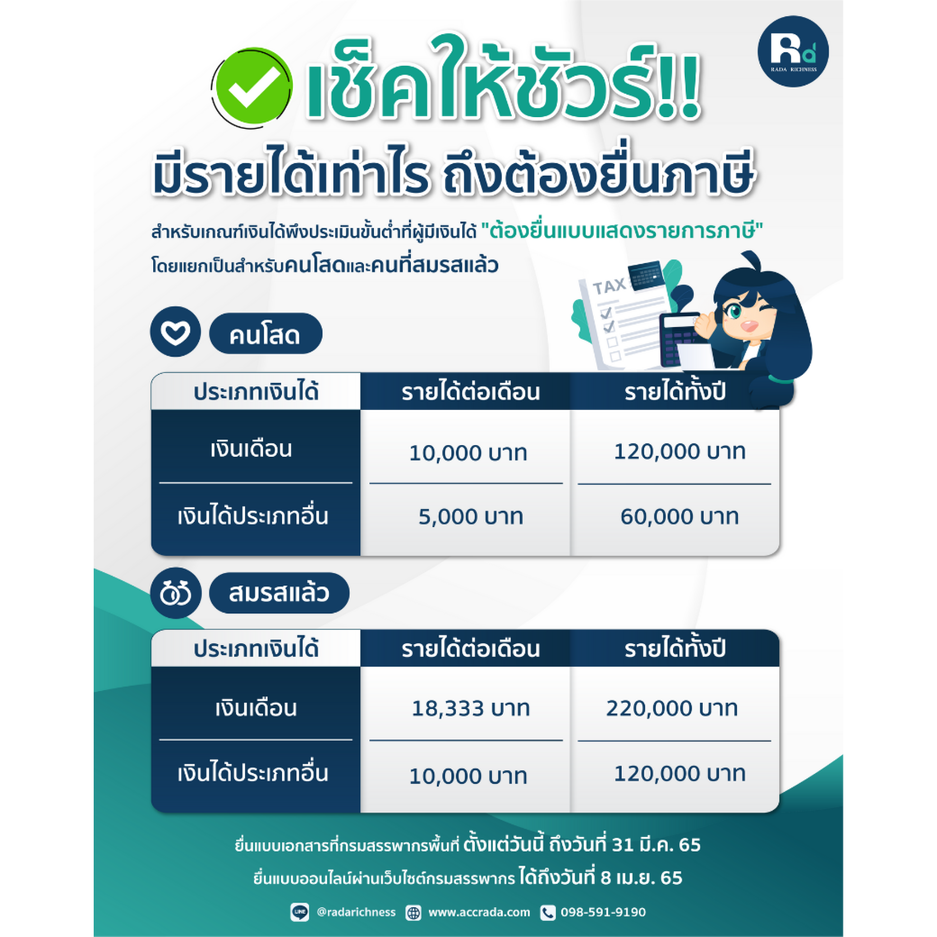 เราได้รวบรวมเกณฑ์เงินได้พึงประเมินขั้นต่ำที่ผู้มีเงินได้ “ต้องยื่นแบบแสดงรายการภาษี” โดยแบ่งเป็นสำหรับคนโสดและคนที่สมรสแล้ว
